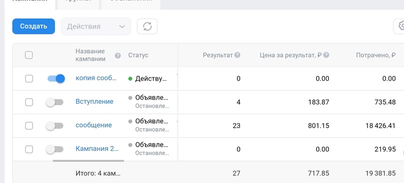 Хочу обратить внимание, что не все сообщения отражаются в результатах статистика РК т.к. если клиент после рекламы сделал более 3-х касаний в группе, то он уже не попадает в статистике. Поэтому по факту сообщений было больше, чем указано в статистике.